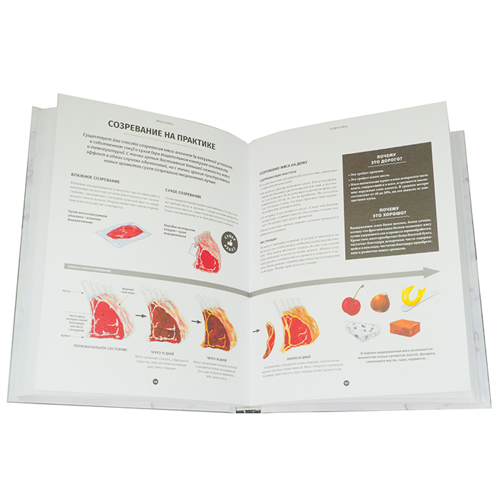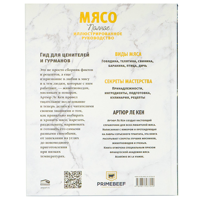 «Окажите животному честь — приготовьте вкусно его мясо» В издательстве «Попурри» вышла книга Артюра Ле Кена «Мясо. Полное иллюстрированное руководство». Книга раскрывает секреты лучших мировых заводчиков и мясников, опираясь на новейшие научные исследования. Текст украшает более 450 акварельных иллюстраций. Это руководство для эстетического удовольствия и настоящего гурманского наслаждения. Автор провел тщательное исследование всех процессов, связанных с приготовлением разнообразных видов мяса. Для написания этой книги Артюр Ле Кен обратился к экспертам — мяснику Жану Дено и животноводу Фреду Менаже. Они производят и продают мясо и птицу высочайшего качества. Как утверждает автор, именно невероятная преданность делу этих людей вдохновила его на написание книги про мясо. В руководстве представлены прекрасные подробные описания самых интересных, редких и удивительных пород животных, которые когда-либо существовали. Экскурсия в мир мяса начинается с говядины. Артюр Ле Кен рассказывает, кто есть кто в коровьем се